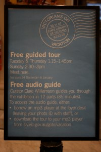 After looking over their digitisation facilities, I had a look at the Victorians on Vacation temporary exhibition. It is an interesting exhibition with some very evocative images, but I found their online audio guide to be a good model for us. There is clear signage about it as you enter the exhibition and I asked the staff about their free to hire MP3 players. They are iPod Nanos (about $199 each I think) and visitors can borrow them for a photo ID. They’ve had only one stolen and for that one no photo ID was left – just stolen credit cards. They’re pretty well used, especially on the weekends, but they only had a few to lend out. They say the use of the guides varies depending on the exhibition content, but they are expecting them to be popular for their next exhibition, The Medieval Imagination, opening in late March.