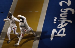 Image above: Italy’s Giovanna Trillini (L) competes against Cuba’s Misleydis Company during the Women’s individual Foil elimination round of 32 match on August 11, 2008 at the Fencing Hall of National Convention center, as part of the 2008 Beijing Olympic games. Trillini won 15-7. (ADRIAN DENNIS/AFP/Getty Images).
