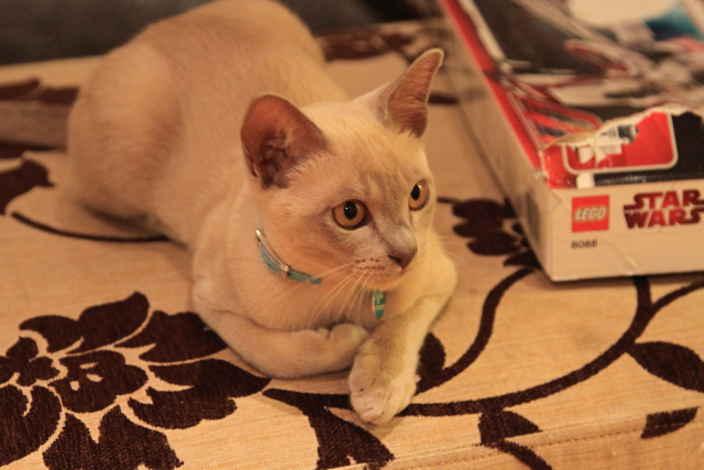 Sometimes even my nephew lost faith in my Lego assembly super powers, but their new young kitten Jeffrey (pictured above with the box) didn’t. He was quite helpful inside the box when we both tried to find a small grey slopey bit with a round thingy on it. He is probably four months old now and simply adorable. He races around like a crazy cut snake and is always playing games with himself or anyone else who wants to offer some naked skin to his gaming tools (sharp teeth and claws).