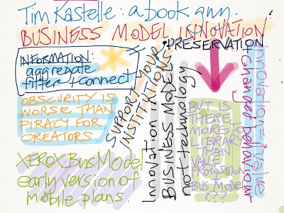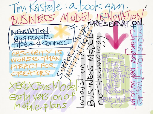 The sketch notes above are from one of the first keynotes by Tim Kastelle from the University of Queensland Business School. I think one of his best messages for libraries (which you can see above) was to aggregate, filter and connect. I also liked his suggestion that obscurity was worse than piracy for content creators. He urged us to consider innovation in our business model (i.e. behavioural change), not simply in or through technology.