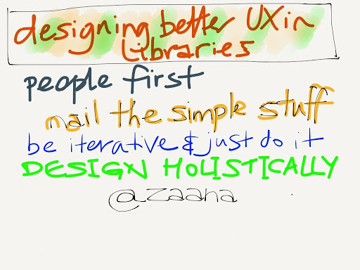 Zaana gave a very short session on designing better user experiences in libraries. Her key messages (above) were few and short, but memorable and wise. I think they were timely reminders and her research is evidence based. She had a verysignificant influence on the under current of service design in this conference and I thank her for her input on that.