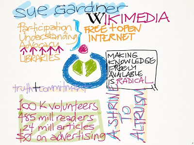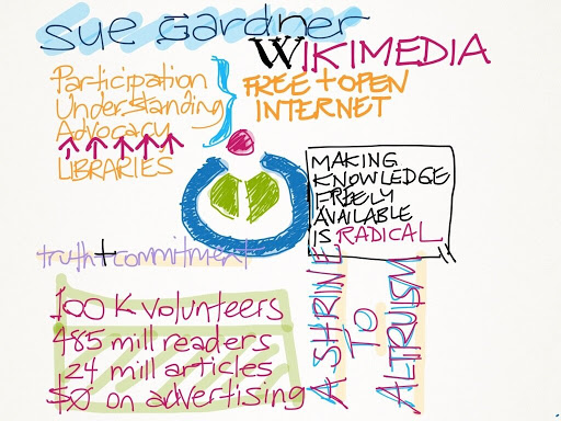 Sue Gardner from Wikimedia left us with some very important reminders about the importance of a free and open internet and how libraries must participate in that as advocates and by helping others to understand more about it. She encouraged us to do what we can to make knowledge freely available, just as Wikipedia does.